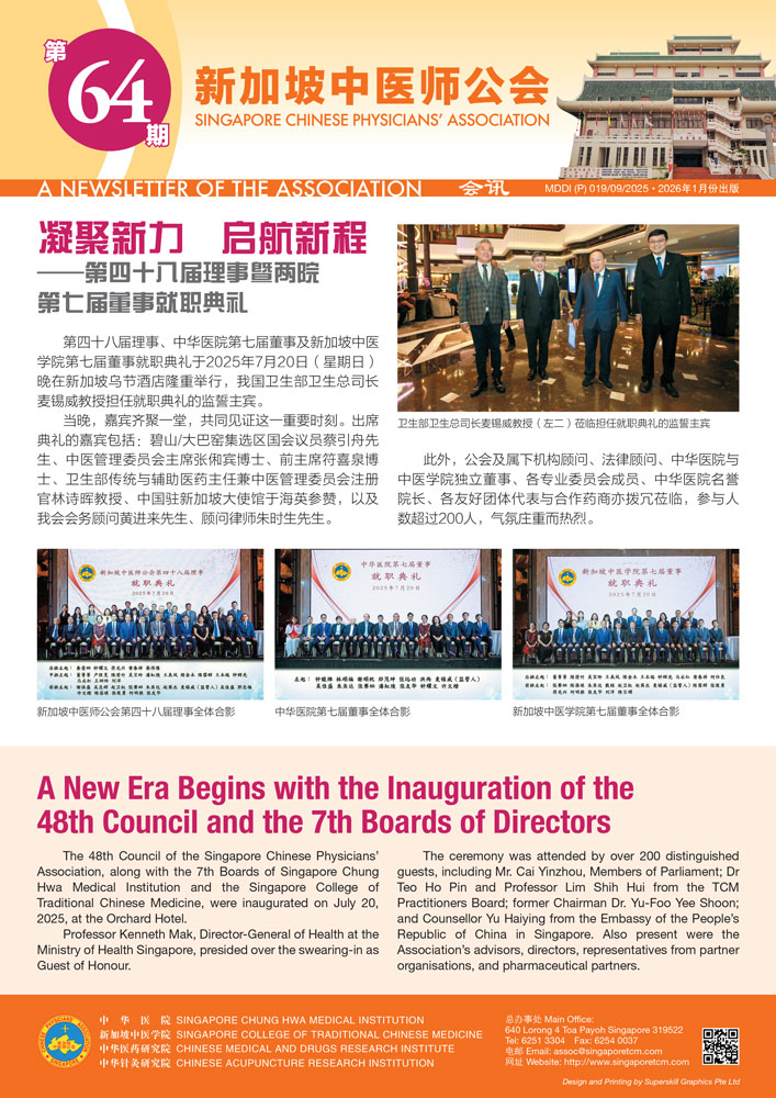 Since February 2007, the Singapore Chinese Physicians' Association 40th Council meeting resolved to have the original name of the newsletter changed from "Singapore Chinese Physicians' Association News Bulletin" to "Singapore Chinese Physicians' Association Newsletter". It was agreed that the newsletter would continue to focus on reporting on important news and updates on the four subsidiaries of the SCPA: Chung Hwa Medical Institution, `Singapore College of Traditional Chinese Medicine, Chung Hwa Medical Research Institute and Chung Hwa Acupuncture Research Institute, to equip new and old members of the SCPA with the latest information and bring about greater understanding and sense of belonging amongst members.